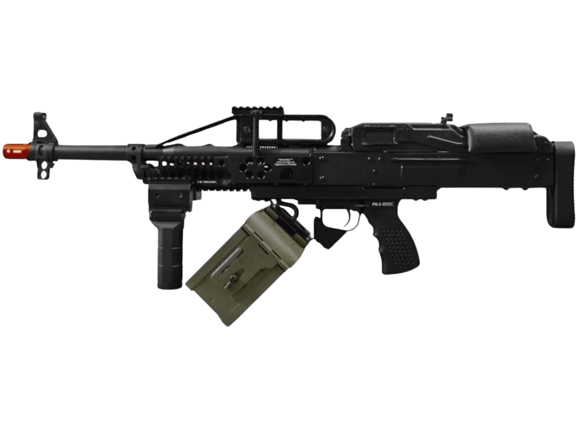 O PKP do Raptor Airsoft bullpup traz todas as sugestões de design do verdadeiro bullpup PKP para o mundo do Airsoft. Baseado nas plataformas PKM AEG existentes, o bullpup PKP Raptor Airsoft apresenta um cano de estilo pesado encurtado e a icônica alavanca de transporte integrada. Internamente, o bullpup PKP utiliza uma GearBox padrão M249 com um casco de GearBox usinado, rolamentos de 8mm e pistola de usinagem de precisão e componentes de bico de ar para fornecer suporte confiável até mesmo no mais aquecido dos tiroteios de Airsoft.