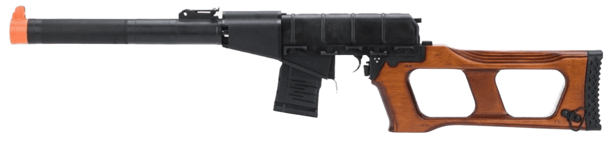 O VSS Vintorez é um rifle sniper russo suprimido, desenvolvido no final dos anos 80 para operações secretas ou clandestinas; um papel evidenciado por sua capacidade de ser retirado para transporte em uma maleta especialmente montada. O Rifle Sniper AEG VSS Vintorez Airsoft da King Arms é totalmente em metal com móveis de madeira reais, com um seletor de modo de disparo realista e funcional, alavanca de segurança em aço e botões funcionais de desmontagem frontal e traseira.
