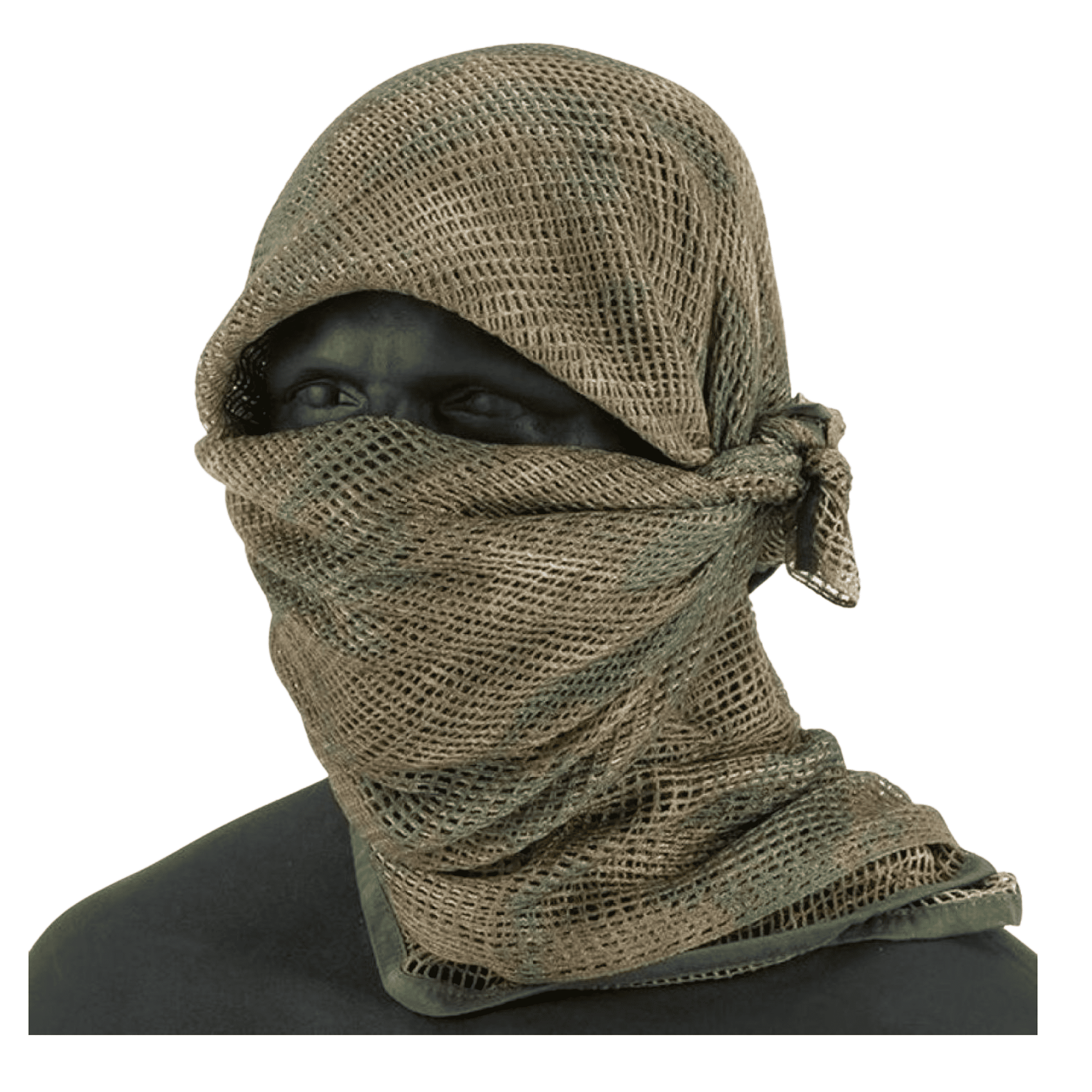 Pode ser usado em uma variedade de configurações: headwrap, shemagh, véu de atirador ou grande variedade de outros usos Pode ser usado para quebrar o perfil de um rifle ou figura humana A construção em malha respirável fornece ventilação para ambientes áridos 71 "de comprimento pode cobrir a maioria de uma pessoa quando deitado O padrão de camuflagem impresso ajuda o usuário a se misturar em uma variedade de ambientes As bordas coladas evitam o desgaste