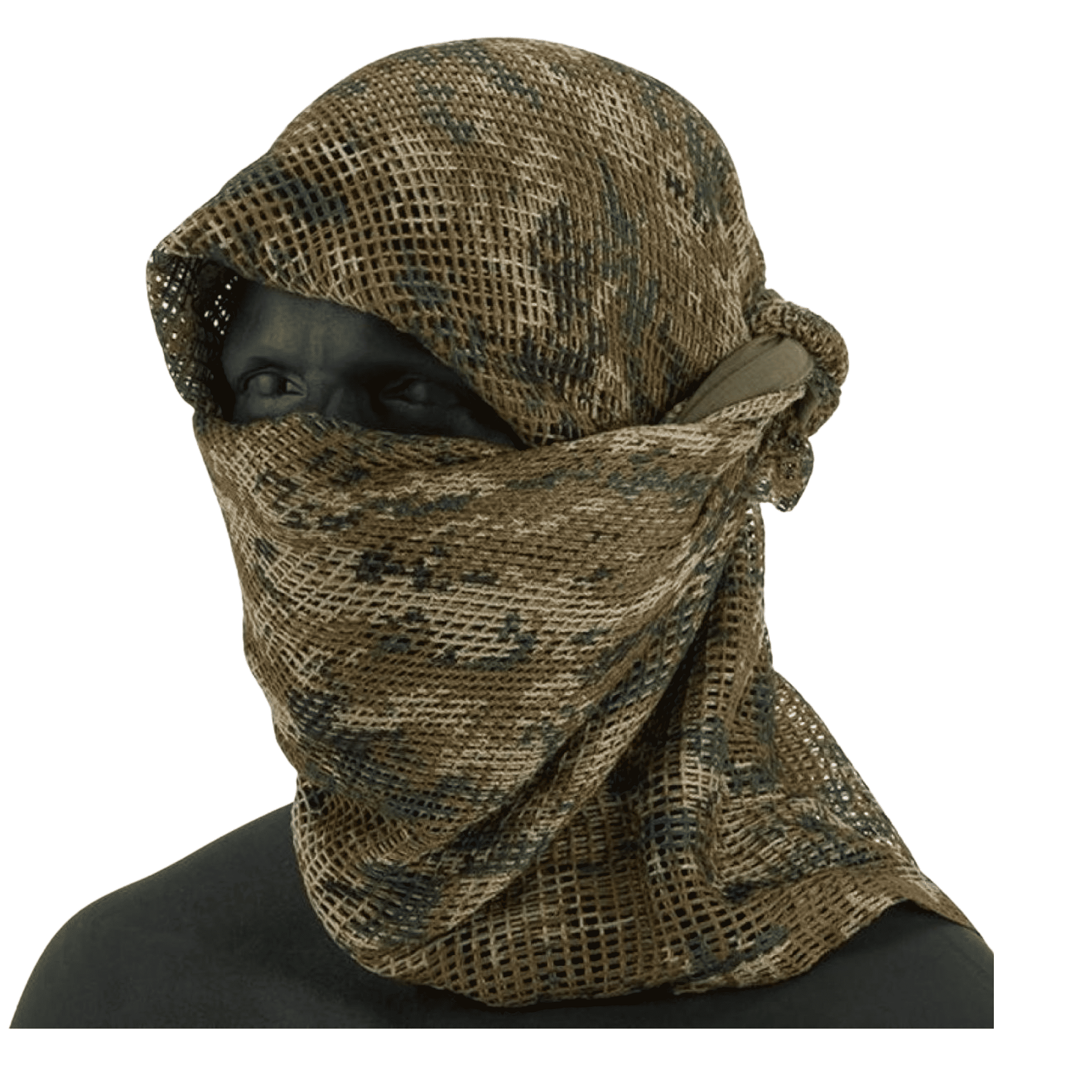 Pode ser usado em uma variedade de configurações: headwrap, shemagh, véu de atirador ou grande variedade de outros usos Pode ser usado para quebrar o perfil de um rifle ou figura humana A construção em malha respirável fornece ventilação para ambientes áridos 71 "de comprimento pode cobrir a maioria de uma pessoa quando deitado O padrão de camuflagem impresso ajuda o usuário a se misturar em uma variedade de ambientes As bordas coladas evitam o desgaste